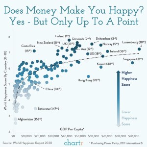 I wrote on this subject some time ago and although money makes the world go round it isn’t the root of all evil, however enough seems to be just that – too little as Charles Dickens wrote is a miserable state to being but add a little more and gradually one becomes happier and happier … but only too a point – it seems certain that at best it follows the law of diminishing returns – Just how big a yacht does one need for true happiness?